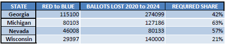 It’s worth taking a moment to look at deltas one cannot obtain without painstaking data entry. First, I computed the number of votes lost from 2020 to 2024 for each state and party. Second, I determined the number of votes needed to flip a state from red to blue. Finally, I calculated the share of lost votes needed to accomplish that change. The states where this was even possible appear below–the hill was a little steep but quite possible. The conventional wisdom that Democrats win if more people vote does seem to be correct.